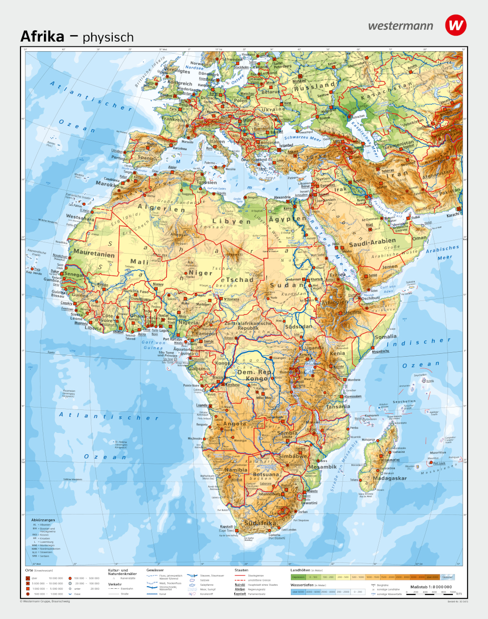 Die Schulwandkarte "Afrika" des Verlags Westermann bietet eine umfassende Darstellung des Kontinents und ist ein unverzichtbares Bildungsinstrument für alle Bildungseinrichtungen, die einen vertieften Einblick in die geografischen und politischen Strukturen Afrikas vermitteln möchten. Diese doppelseitige Karte zeigt auf der Vorderseite eine physische und auf der Rückseite eine politische Ansicht, wodurch sie eine breite Palette an Lehrmöglichkeiten bietet.