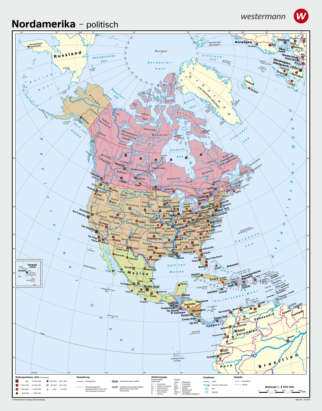Auf der Rückseite der Karte wird die politische Aufteilung Nordamerikas gezeigt, inklusive aller Länder und wichtiger Städte wie die USA, Kanada und Mexiko sowie deren Hauptstädte und wichtige administrative Grenzen. Diese Seite ist besonders wertvoll, um die politischen Strukturen des Kontinents zu vermitteln und bietet Lehrern die Möglichkeit, wichtige gesellschaftliche und politische Themen zu behandeln.