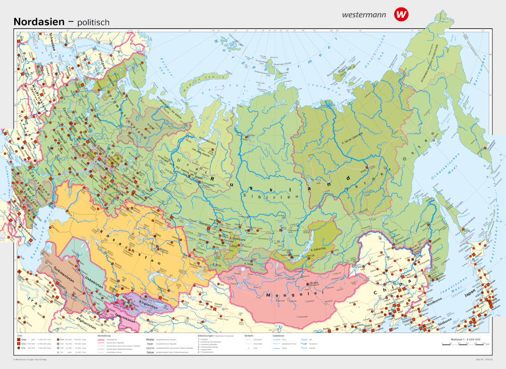 Auf der Rückseite der Karte wird die politische Aufteilung Nordasiens dargestellt, die die verschiedenen Länder und wichtigen Regionen umfasst. Diese Seite bietet eine exzellente Grundlage für den Unterricht in politischer Geografie und ermöglicht es den Schülern, ein besseres Verständnis für die politischen Grenzen, Hauptstädte und wichtigen städtischen Zentren der Region zu entwickeln. Die Karte erleichtert Diskussionen über internationale Beziehungen und geopolitische Strategien in dieser geopolitisch bedeutsamen Region der Welt.