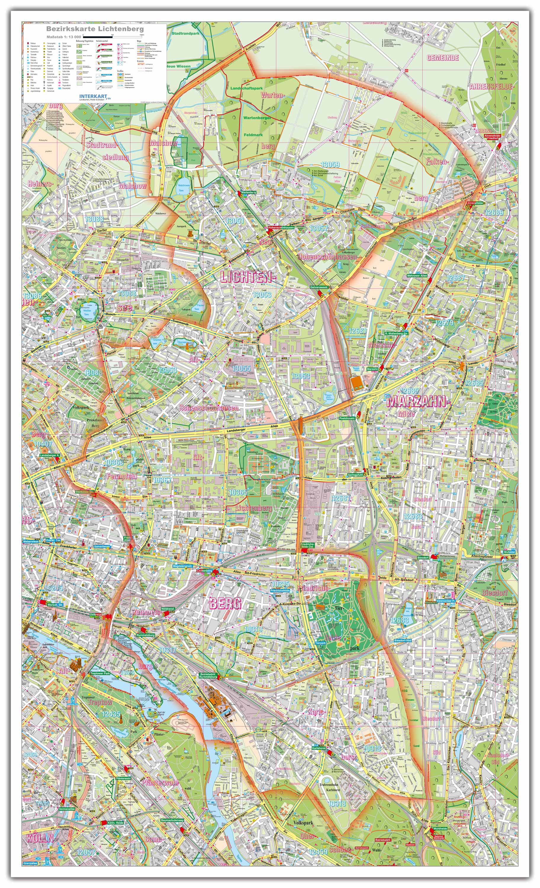 Lichtenberg Stadtplan 72 × 100 cm: Der übersichtliche Bezirksplan zeigt das komplette Straßennetz mit Namen, dazu Parks & Grünflächen, Seen, Spielplätze, Sehenswürdigkeiten und öffentliche Gebäude. Die klare Kartografie sorgt für hervorragende Lesbarkeit an der Wand – im Büro, in der Schule oder zu Hause.