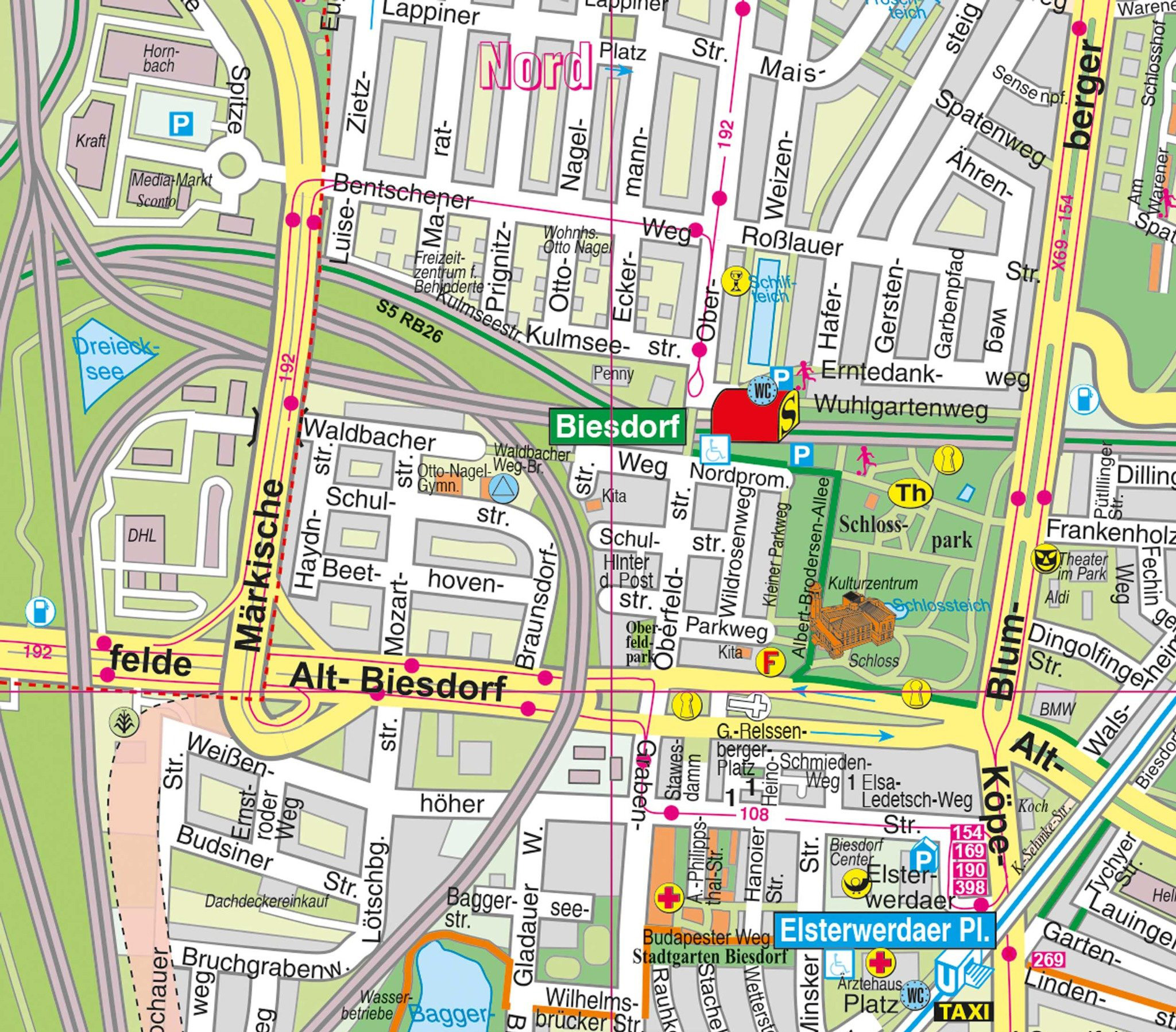 - Inhalte: Straßennamen, Wege, Parks/Grünflächen, Seen, Spielplätze, Sehenswürdigkeiten, ÖPNV (S/U/Regio/Bus/Tram), Fuß- & Radwege, ausführliche Legende