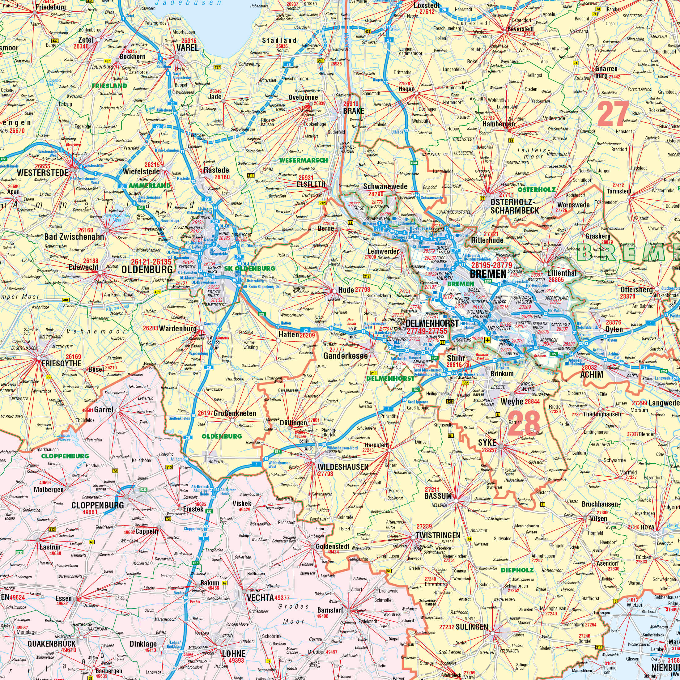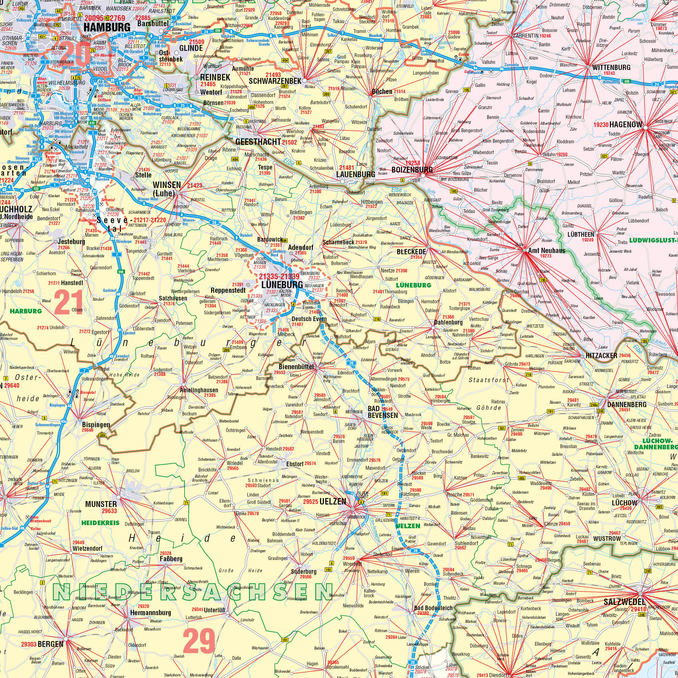- 5-stellige PLZ: Präzise Darstellung der fünfstelligen Postleitzahlen an den Hauptorten, ergänzt durch rote Verbindungslinien zu den zugehörigen Ortschaften.