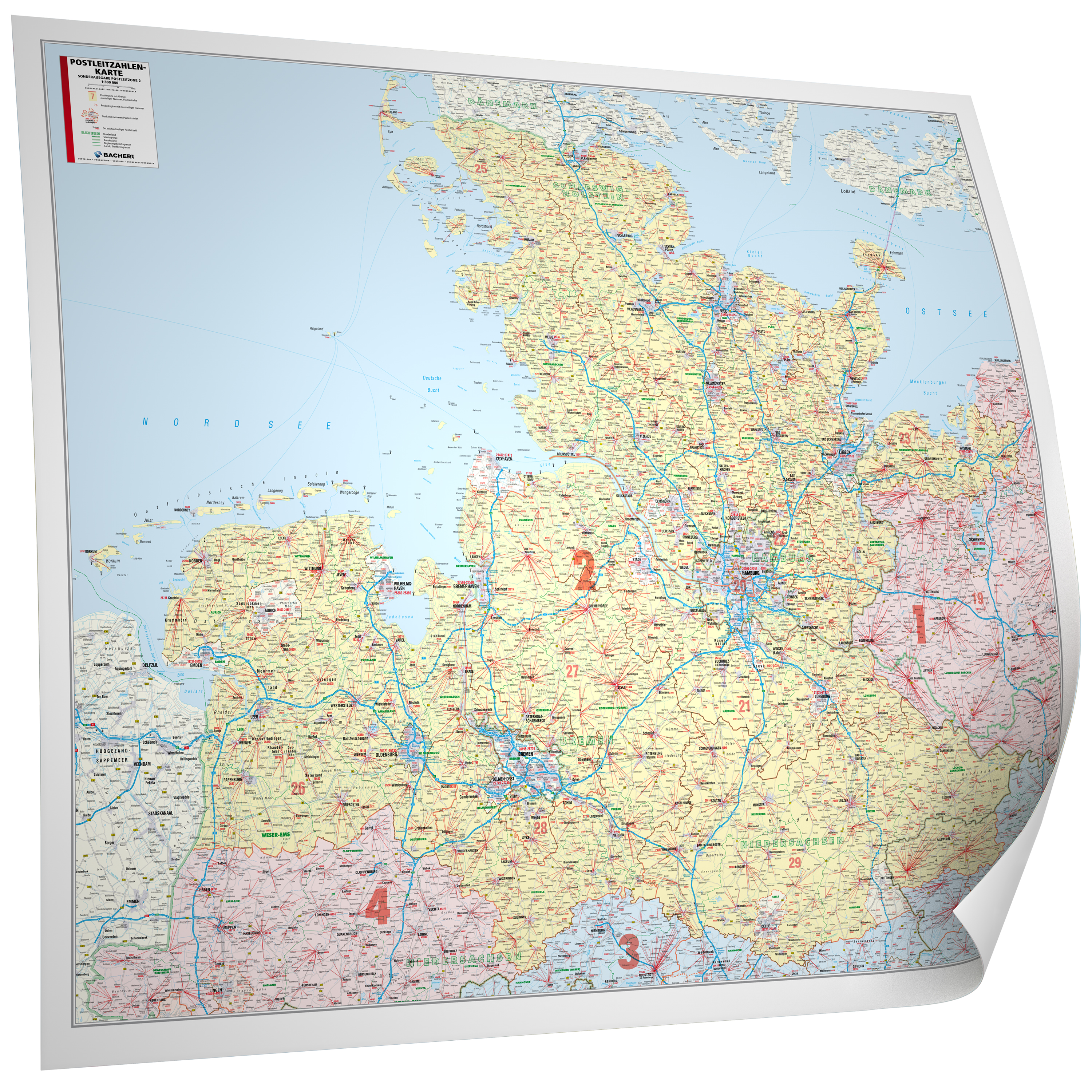 Behalten Sie den vollen Überblick über den Norden: Die Postleitzahlenkarte der Zone 2 ist ein hochpräzises Arbeitsmittel für alle Unternehmen, die in Hamburg, weiten Teilen Schleswig-Holsteins und dem nördlichen Niedersachsen aktiv sind. Diese Karte kombiniert postalische Daten mit einer detaillierten topografischen Darstellung und bildet so die perfekte Grundlage für Ihre strategischen Entscheidungen in Vertrieb, Service und Logistik.