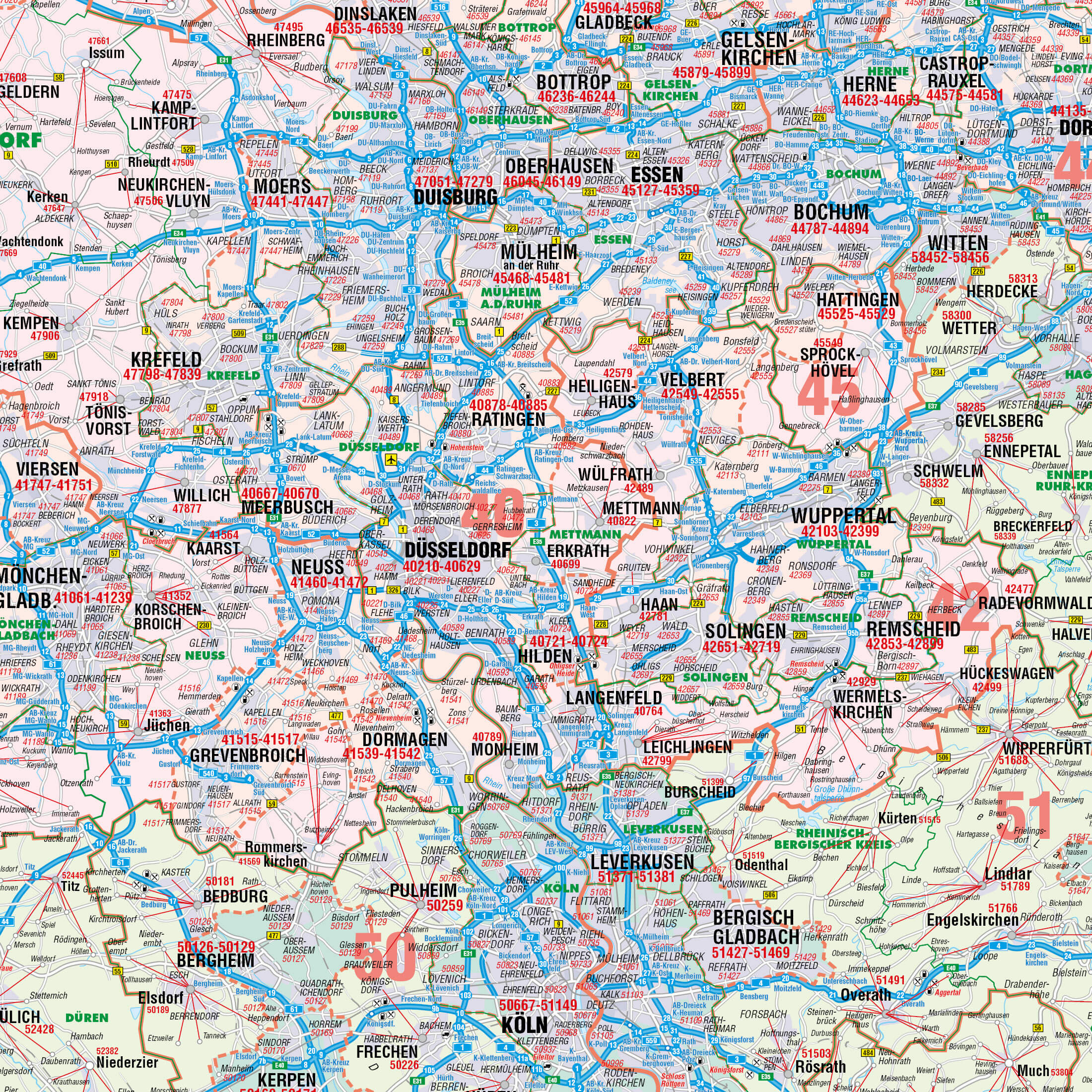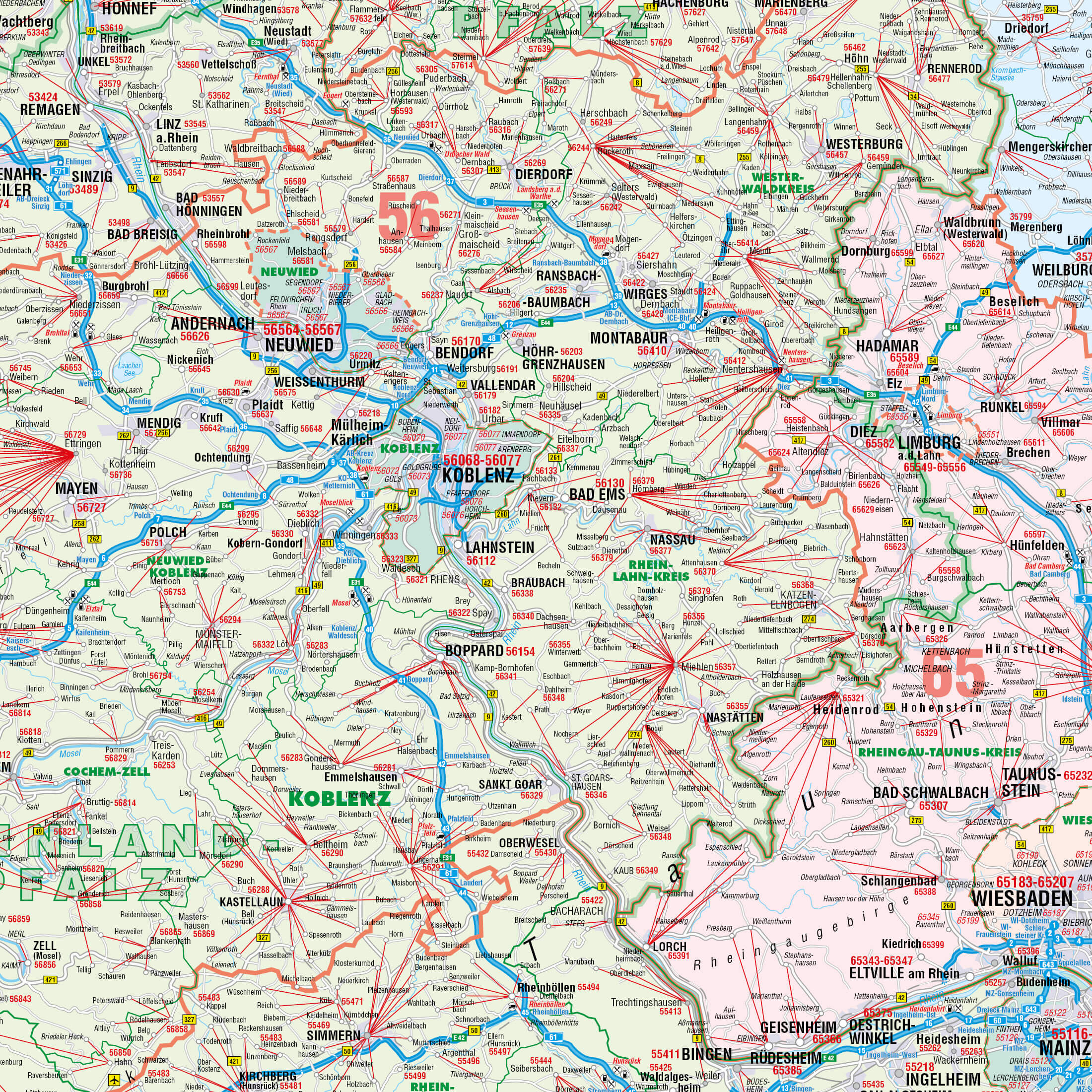 - 5-stellige PLZ: Exakte Darstellung der fünfstelligen Postleitzahlen an den Hauptorten, ergänzt durch rote Verbindungslinien zu den zugehörigen Gebieten.