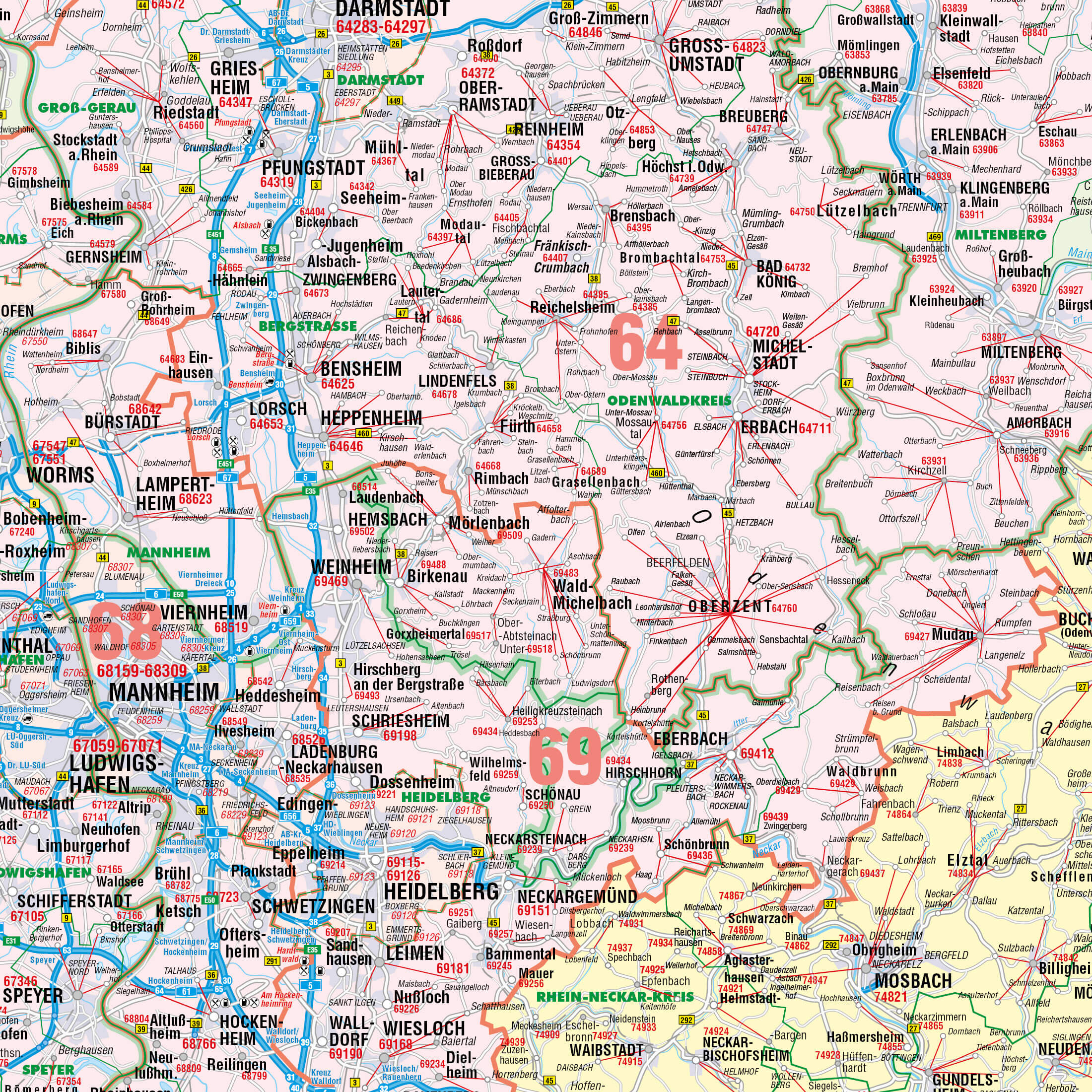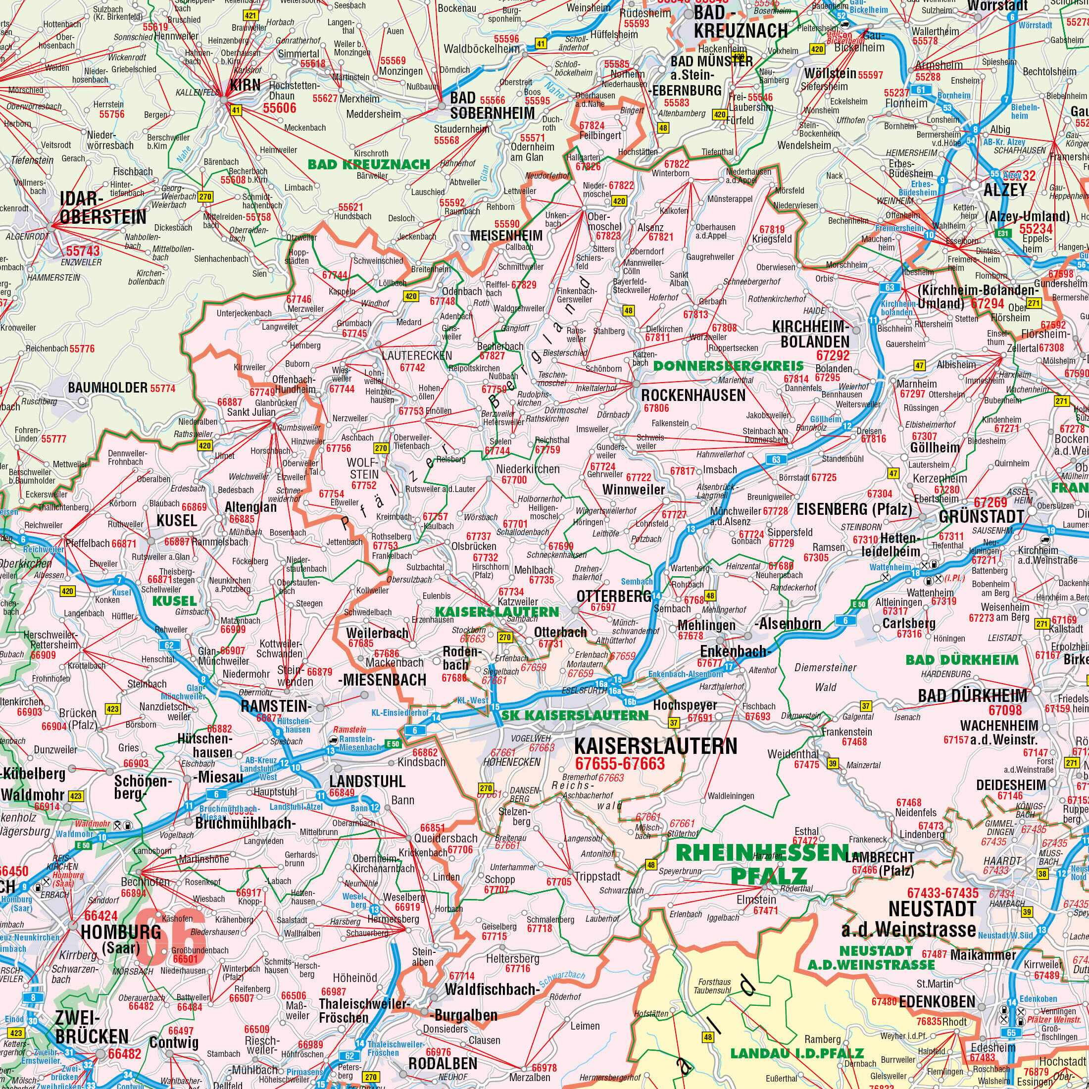 - 5-stellige PLZ: Präzise Kennzeichnung der fünfstelligen Postleitzahlen an den Hauptorten, ergänzt durch rote Verbindungslinien zu den zugehörigen Gebieten.
