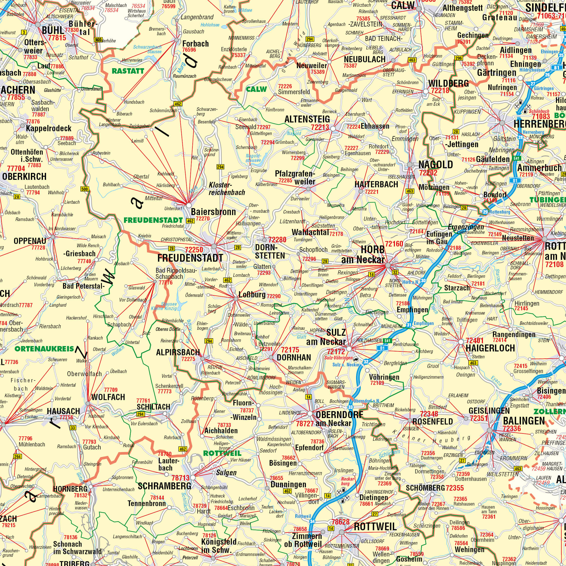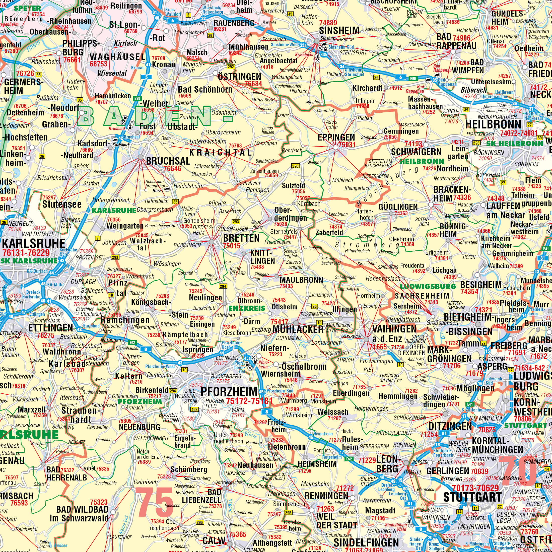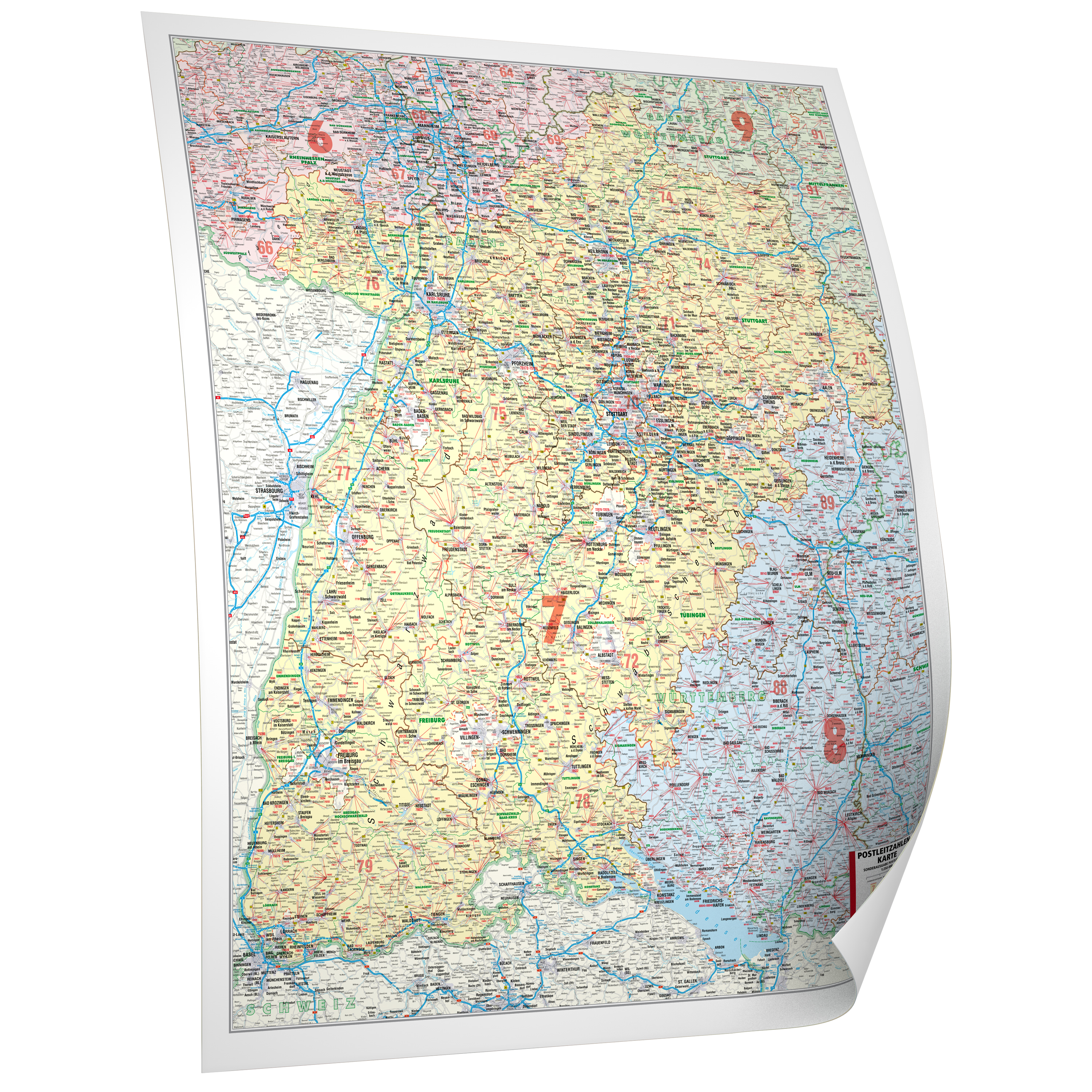 - Postleitzahlen-System: Klare Darstellung der einstelligen Zonen, der zweistelligen Leitgrenzen sowie der exakten 5-stelligen Postleitzahlen am Hauptort.