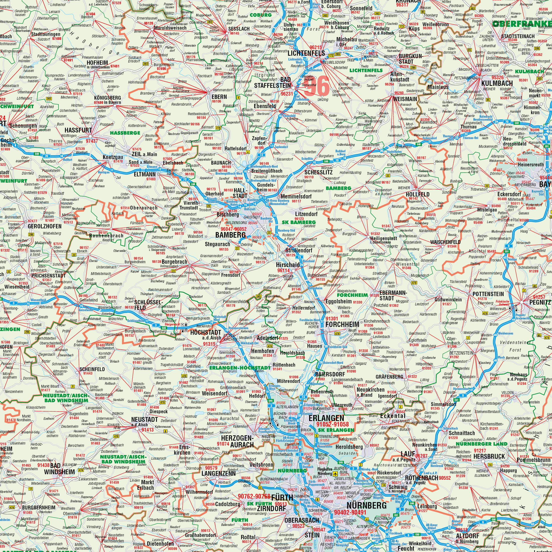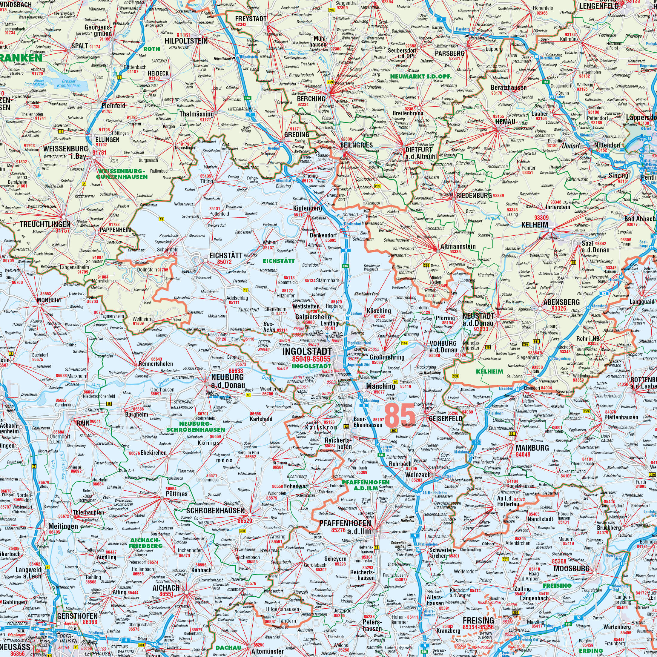 - 5-stellige PLZ: Exakte Darstellung der fünfstelligen Postleitzahlen am Hauptort, inklusive roter Verbindungslinien zu den zugehörigen Orten.