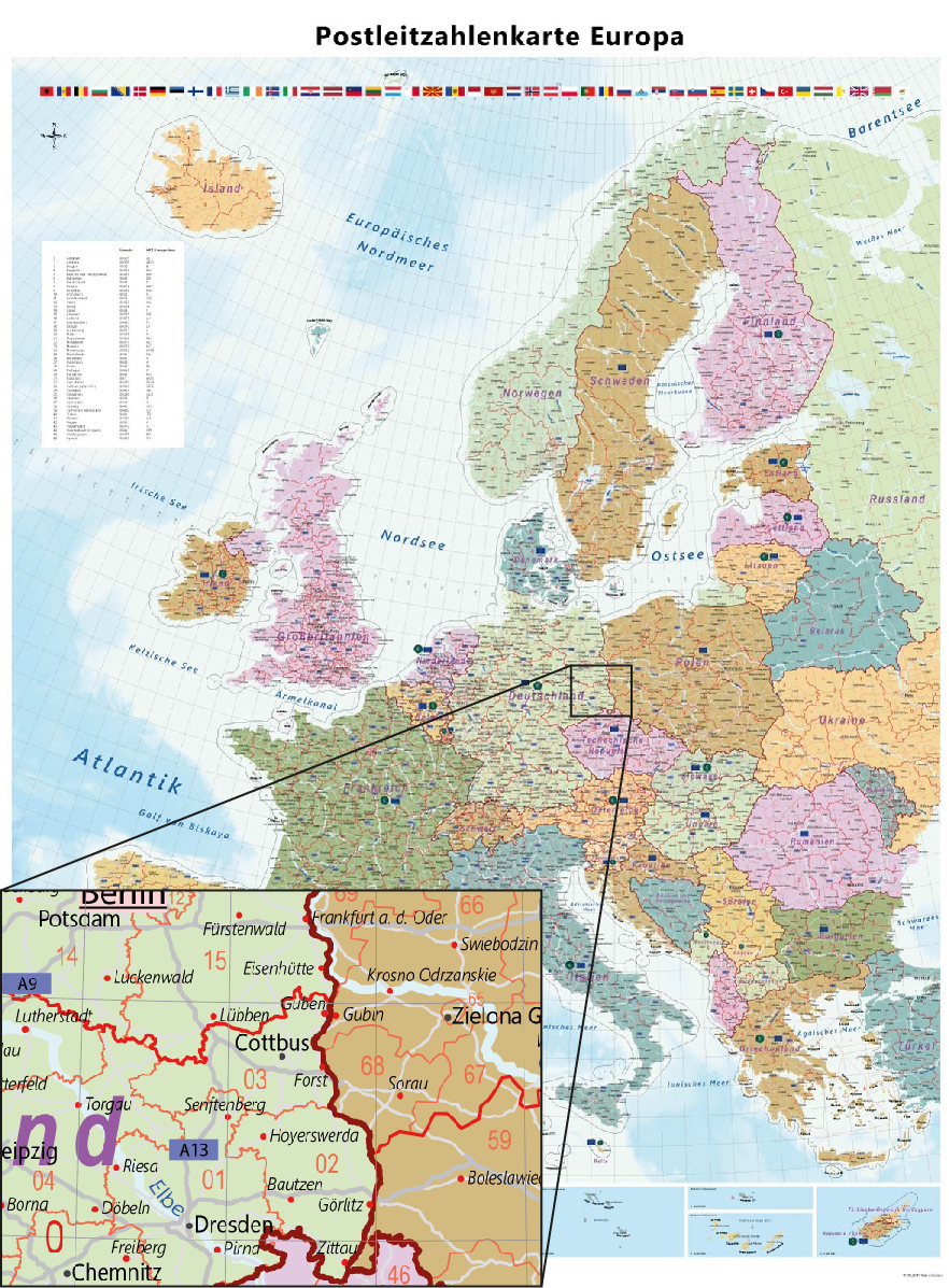 - Inhalte: PLZ 1–2-stellig, Staatsgrenzen, EU-/Euro-Markierung, Flaggen, Telefonvorwahlen, Kfz-Kennungen, ca. 3.500 Städte, Autobahnen, Hauptstraßen, wichtigste Flussläufe