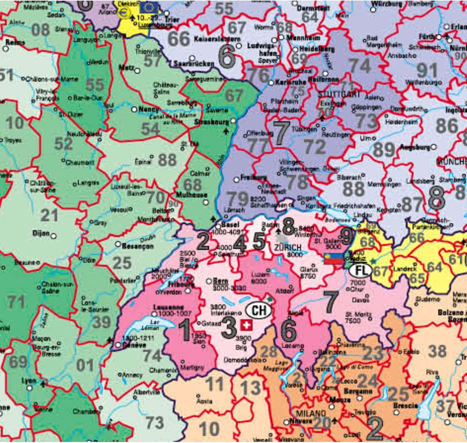 - Motiv: Europa – Postleitzahlenkarte (politische Grenzen & PLZ-Zonen)