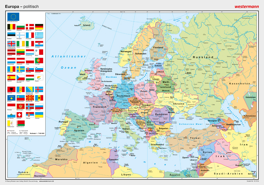Die Karte zeigt eine umfassende politische Ansicht Europas und hebt Ländergrenzen, Hauptstädte und wichtige Städte hervor. Die klare und übersichtliche Gestaltung erleichtert das Verständnis politischer Grenzen und bietet einen ausgezeichneten Überblick über den europäischen Kontinent. Durch den Maßstab von 1:7.500.000 sind selbst kleinere Länder und geografische Details gut erkennbar, was die Karte besonders lehrreich macht.