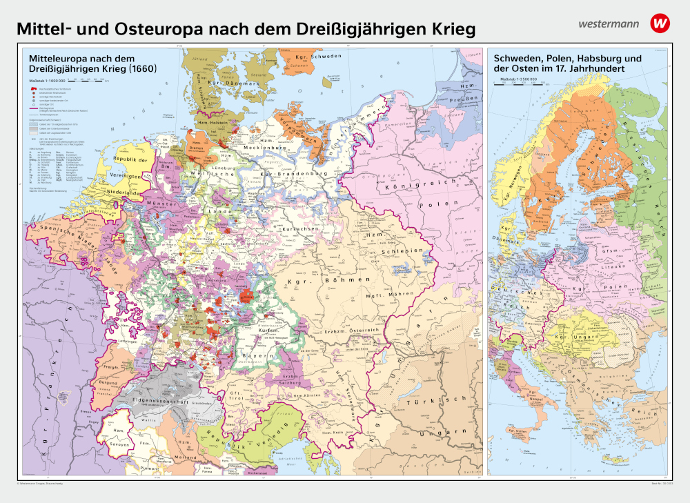 Die historische Schulwandkarte "Mittel- und Osteuropa nach dem Dreißigjährigen Krieg" des renommierten Verlags Westermann bietet eine detaillierte Darstellung der territorialen Veränderungen und politischen Zustände in Europa nach einem der prägendsten Konflikte der Frühen Neuzeit. Diese Karte ist speziell für den Geschichtsunterricht konzipiert und unterstützt Schülerinnen und Schüler dabei, die komplexen historischen Entwicklungen und deren langfristige Auswirkungen auf Europa zu verstehen.