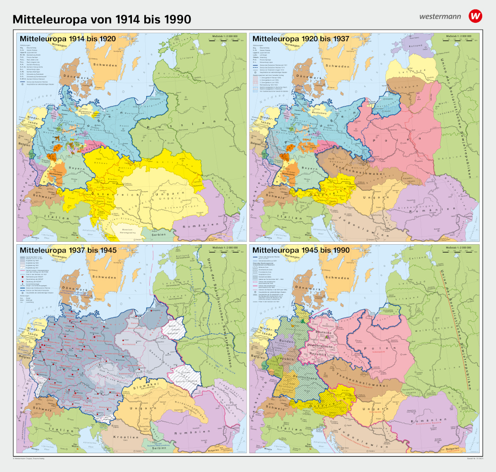 Diese Wandkarte ist besonders wertvoll für den Geschichtsunterricht, da sie Schülerinnen und Schülern hilft, ein besseres Verständnis für die bedeutenden historischen Ereignisse und Prozesse zu entwickeln, die Mitteleuropa im 20. Jahrhundert geprägt haben. Lehrer können die Karte nutzen, um visuell zu veranschaulichen, wie Grenzen und politische Strukturen sich im Laufe der Zeit verändert haben, und um Diskussionen über die Ursachen und Konsequenzen dieser Veränderungen zu fördern.