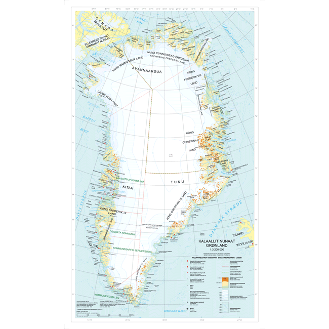 - Orte & Infrastruktur: Siedlungen und wichtige Orte (z. B. Nuuk, Ilulissat, Sisimiut); Flugplätze/Flughäfen und Verbindungen in Küstennähe sind übersichtlich eingetragen.