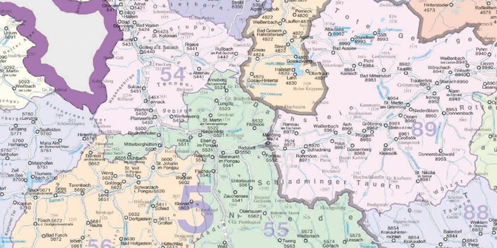 - Feindetailierte PLZ: vierstellige Postleitzahlen für Städte und Gemeinden klar dargestellt.