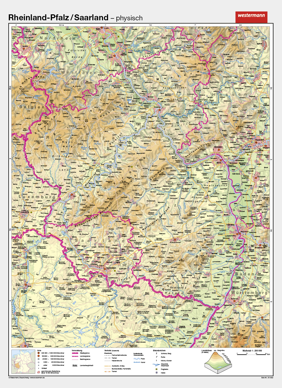 Die detaillierte und großformatige Schulwandkarte "Rheinland-Pfalz / Saarland" des Verlags Westermann ist eine hervorragende Ressource für Bildungseinrichtungen aller Art. Mit einer physischen Darstellung auf der Vorderseite und einer politischen Karte auf der Rückseite bietet dieses Lehrmittel umfassende Informationen und unterstützt den Erdkunde- und Geografieunterricht von der Primarstufe bis zur Hochschulbildung.Produktdetails