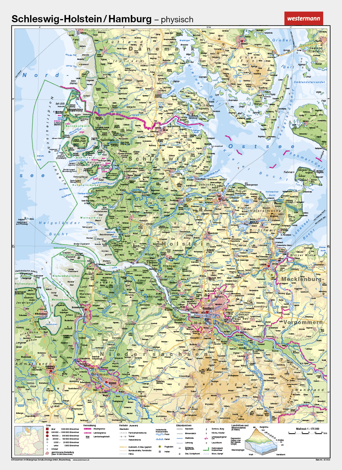 Die Schulwandkarte "Schleswig-Holstein / Hamburg" von Westermann bietet eine umfassende Darstellung der Regionen Schleswig-Holstein und Hamburg, ideal für Bildungseinrichtungen und andere Lernumgebungen. Mit einer physischen Darstellung auf der Vorderseite und einer politischen Karte auf der Rückseite ist diese Karte eine ausgezeichnete Ressource, um geografische und politische Bildung zu fördern.Produktdetails