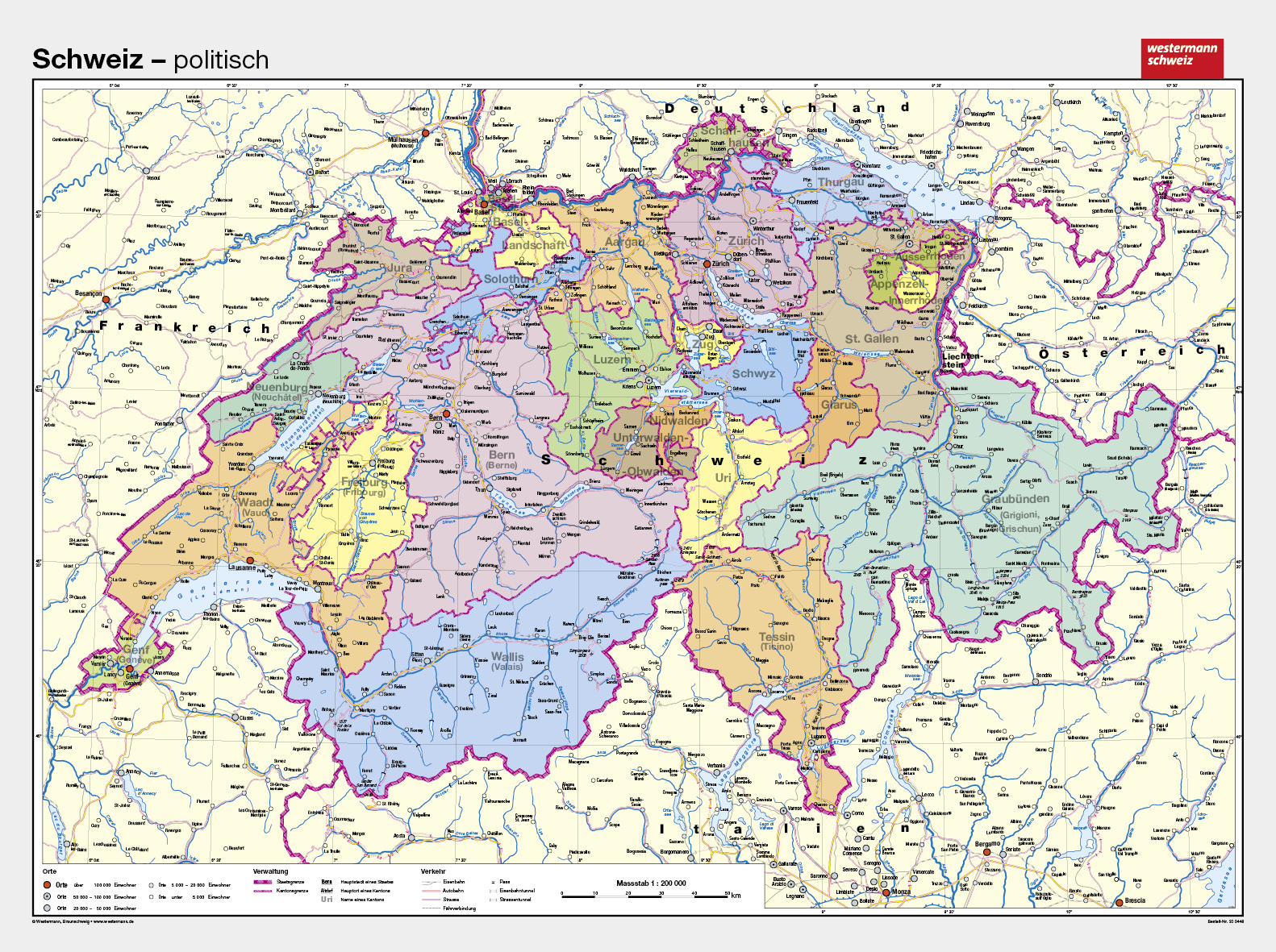 Diese Schulwandkarte bietet eine vollständige politische Ansicht der Schweiz, inklusive aller Kantone und wichtigen Städte. Der Maßstab von 1:200.000 gewährleistet eine detaillierte und gut lesbare Darstellung, die für Bildungszwecke optimal ist. Die politischen Grenzen sind klar hervorgehoben, was die Orientierung erleichtert und das Verständnis für die politische Struktur der Schweiz fördert.Material und Qualität