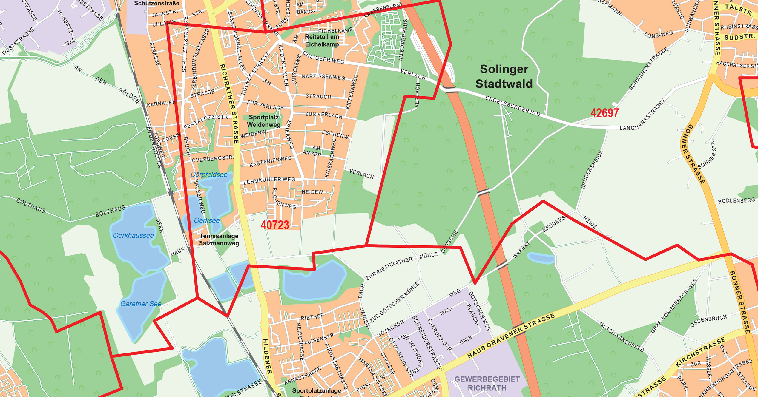 - Inhalte: 5-stellige PLZ-Gebiete, Straßennetz, Stadt-/Ortsteile, Rhein & Gewässer, wichtige POIs