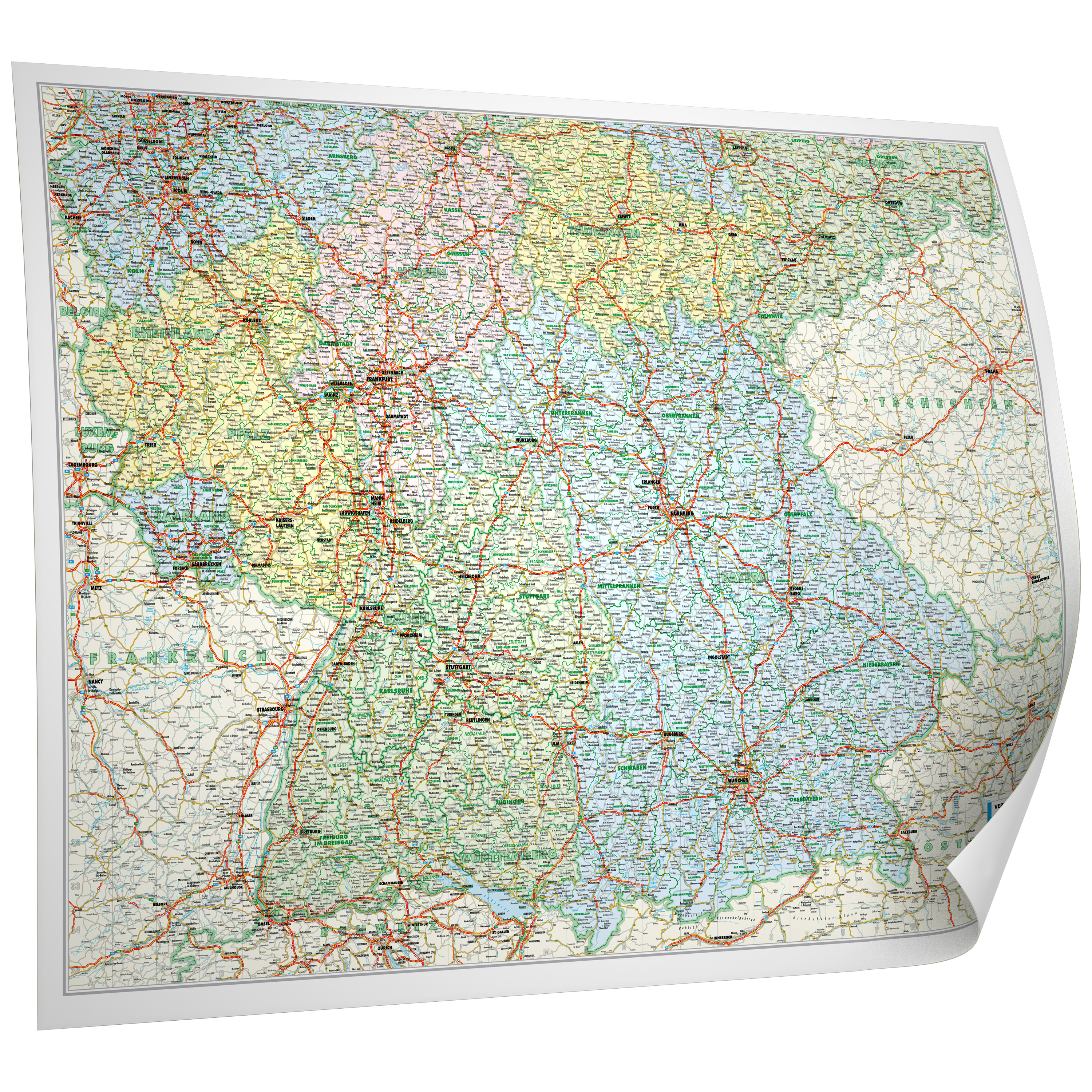 - Klar strukturiert: Pastellfarbene Länderflächen, präzise Kreis- und Gemeindegrenzen.