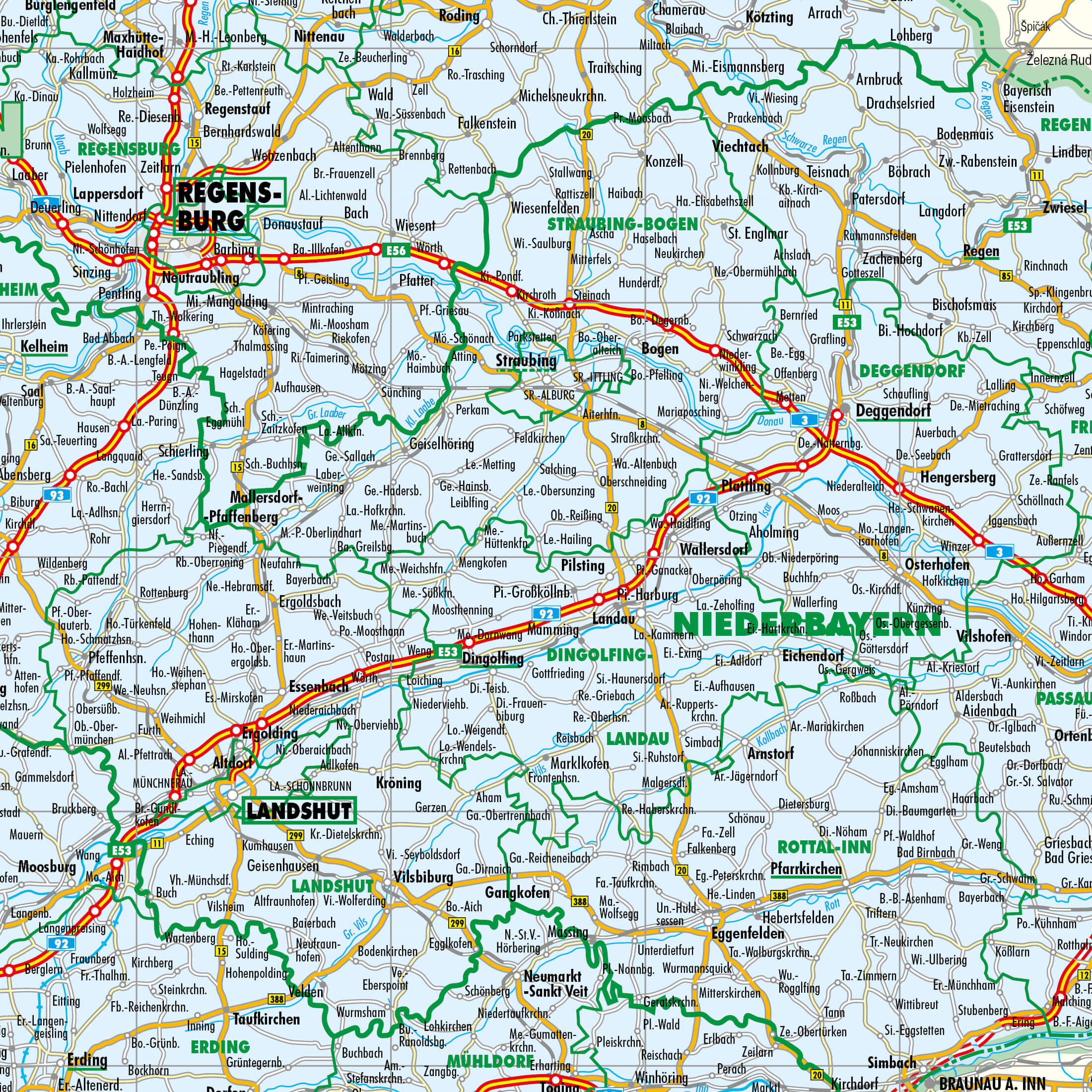 - Verkehrsnetz: Autobahnen (farblich hervorgehoben), Bundes-/Landesstraßen mit Nummern und Bahnlinien – planungsstark und alltagstauglich.