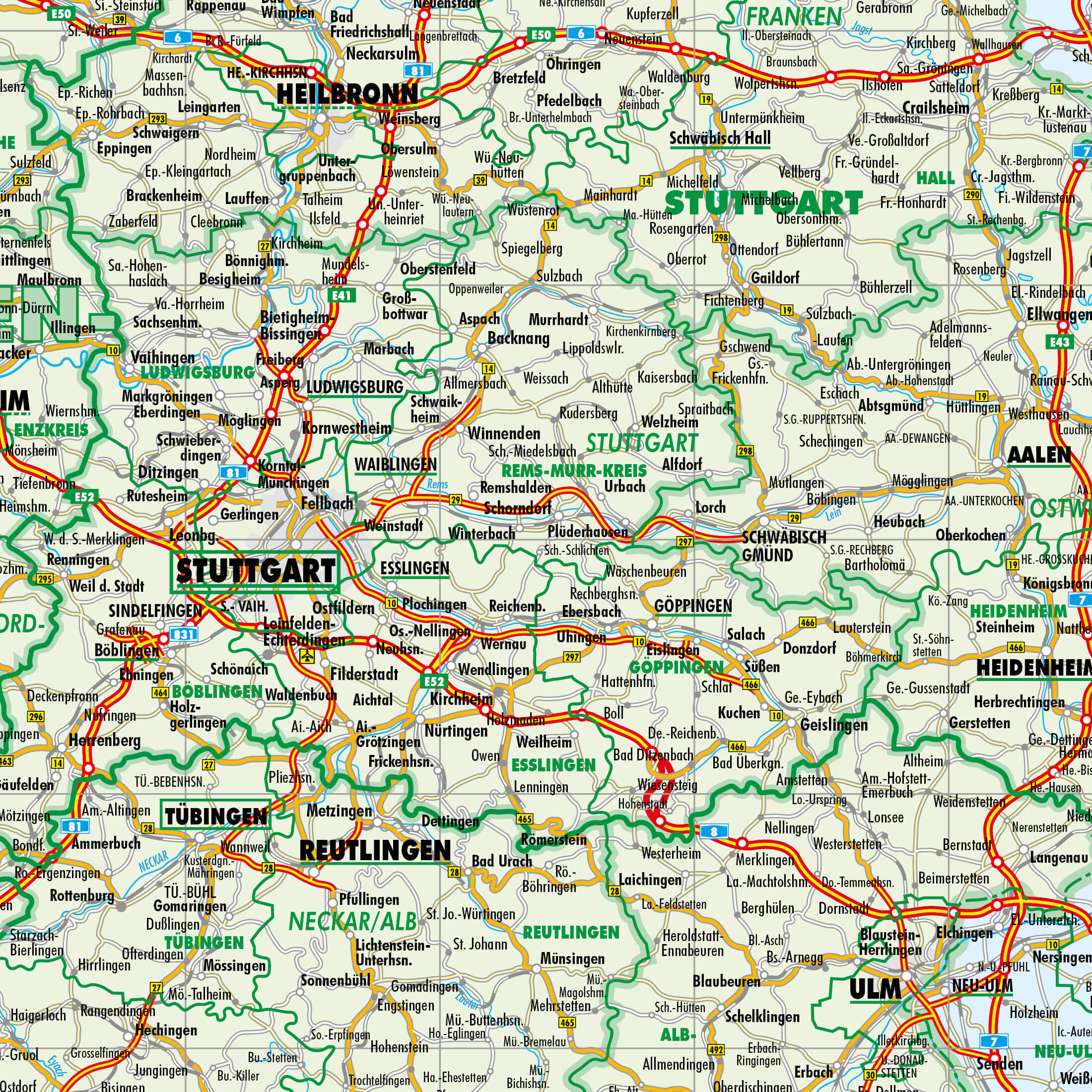 - Inhalte: Verwaltungsgrenzen bis Stadt-/Landkreise, Gemeindezugehörigkeit, Bundesländer (Pastell), Straßennetz mit Nummern, Autobahnen hervorgehoben, Bahnlinien, Ortschaften, Gewässernetz