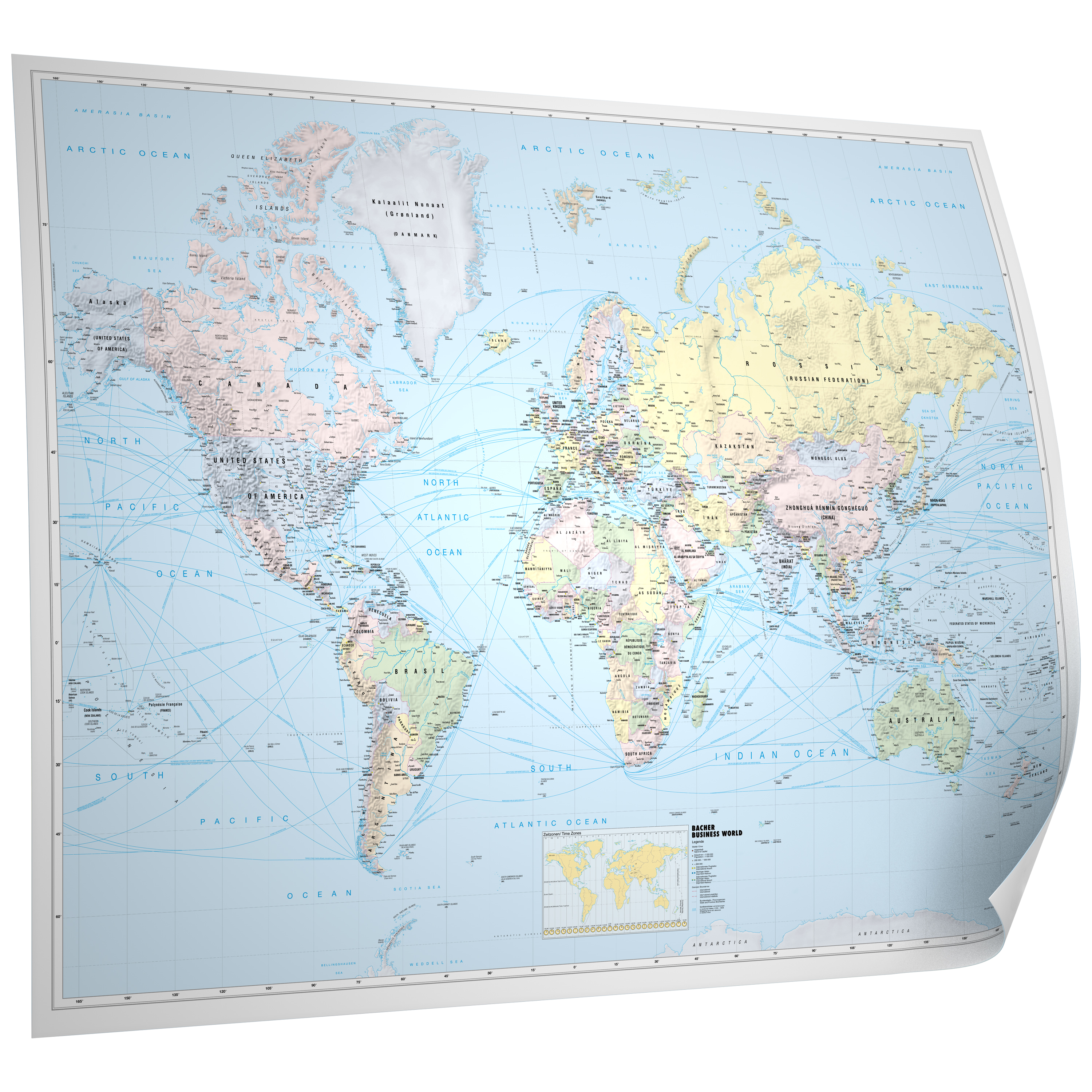 - Inhalte: Länderfarben & Grenzen, Schifffahrtslinien, Seehäfen, internationale Flughäfen, Zeitzonen-Nebenkarte, Geländerelief/Schummerung