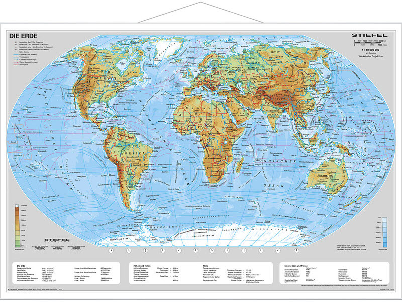 - Inhalte: Ländergrenzen, Hauptstädte & große Städte, Meerestiefen mit warmen/kalten Strömungen, Landschafts- & Gebirgsnamen, Beikarte „Naturgefahren“, Basisinfos zur Erde