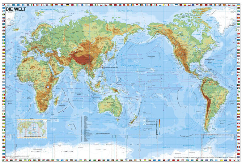 - Inhalte: Flaggen aller Staaten, Hauptstädte & Städte ≥ 500.000, Gebirge/Gebirgszüge (beschriftet), große Flüsse & Gewässer, Höhen-/Tiefenstufen, warme/kalte Meeresströmungen, Eis-/Treibeisgrenze, Zeitzonen