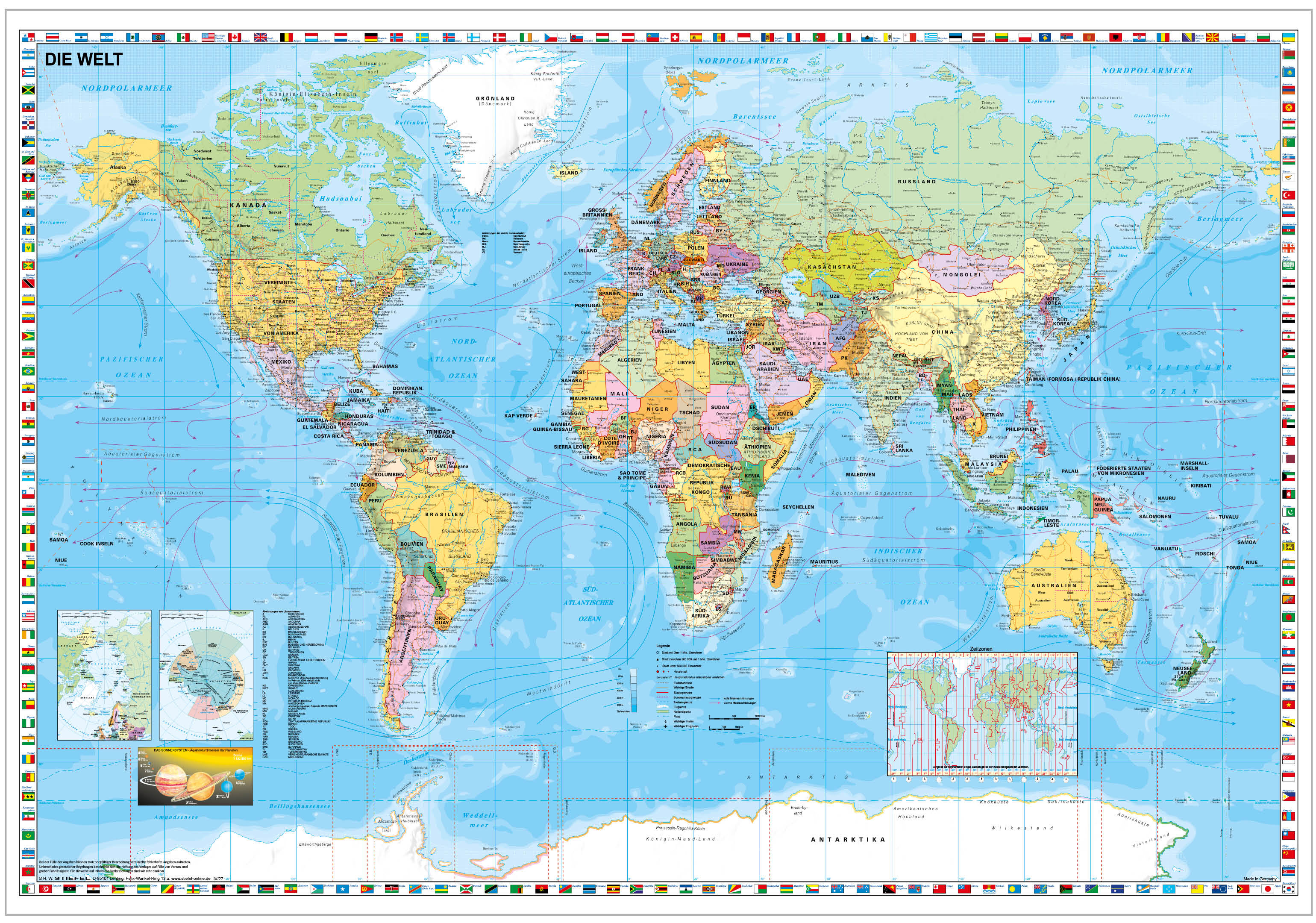 - Inhalte: Ländergrenzen, Hauptstädte/Städte, Meerestiefen, warme/kalte Strömungen, Zeitzonen, Polar-Insets, Seehäfen, internationale Flughäfen, Flaggen, Planetenübersicht