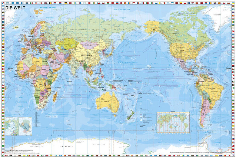 - Inhalte: Flaggen aller Staaten, Hauptstädte & Städte ≥ 500.000 Ew., internationale Flughäfen, bedeutende Seehäfen, große Flüsse & Gewässer, warme/kalte Strömungen, Eis-/Treibeisgrenze, Zeitzonen, Polar-Insets