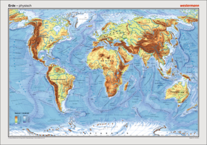 Die physische Karte stellt die natürlichen Merkmale unseres Planeten dar, einschließlich Gebirgszüge, Flüsse, Wüsten und Ozeane. Die detailreiche Darstellung hilft Schülern, ein umfassendes Verständnis der physischen Beschaffenheit der Erde zu entwickeln und die Vielfalt ihrer Landschaften zu schätzen.
