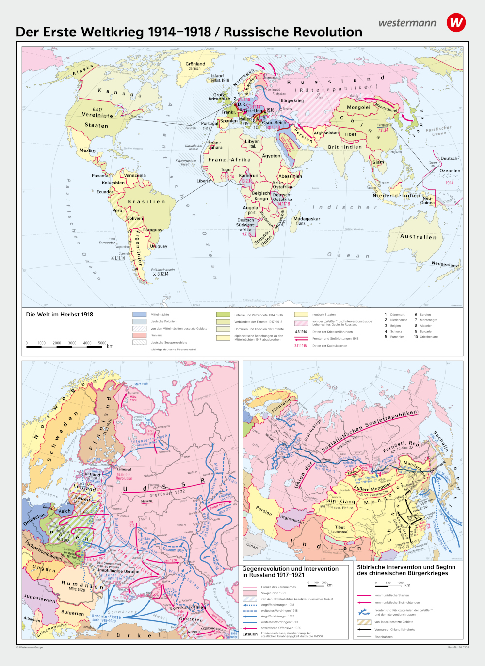 Die Schulwandkarte "Der Erste Weltkrieg 1914 bis 1918" des Verlags Westermann bietet eine detaillierte Darstellung der globalen Konflikte und Ereignisse des Ersten Weltkriegs. Diese umfassende Karte ist ein essentielles Lehrmittel für alle Bildungseinrichtungen, die einen tiefen Einblick in eines der prägendsten historischen Ereignisse des 20. Jahrhunderts vermitteln möchten. Die Karte zeigt auf beidseitig bedruckten Flächen sowohl wichtige Schlachten und Frontverläufe als auch politische Entwicklungen während des Krieges.