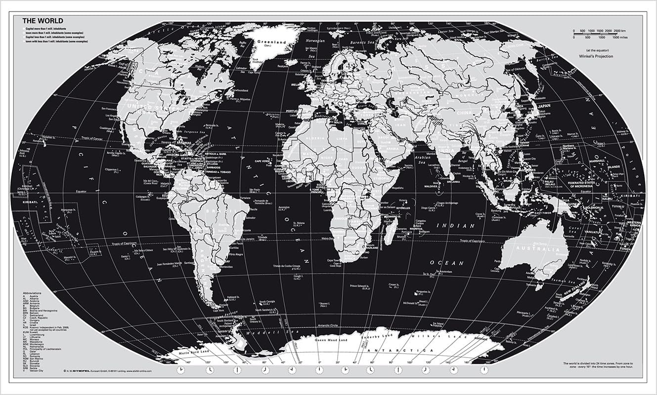 - Englische Beschriftung: country names, capitals & major cities in English – praxistauglich für globale Nutzung.